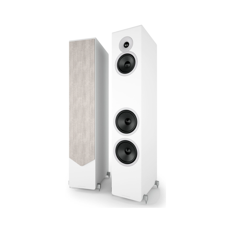 La carcasa está disponible en nogal o en los nuevos acabados blanco o negro mate «tacto de seda», con logotipos serigrafiados y embellecedores y rejillas de color a juego con cada acabado. El nuevo AE320² también se suministra con pies de aluminio y cubiertas de pincho que se integran fácilmente en la decoración de cualquier hogar y respetan la superficie del suelo.