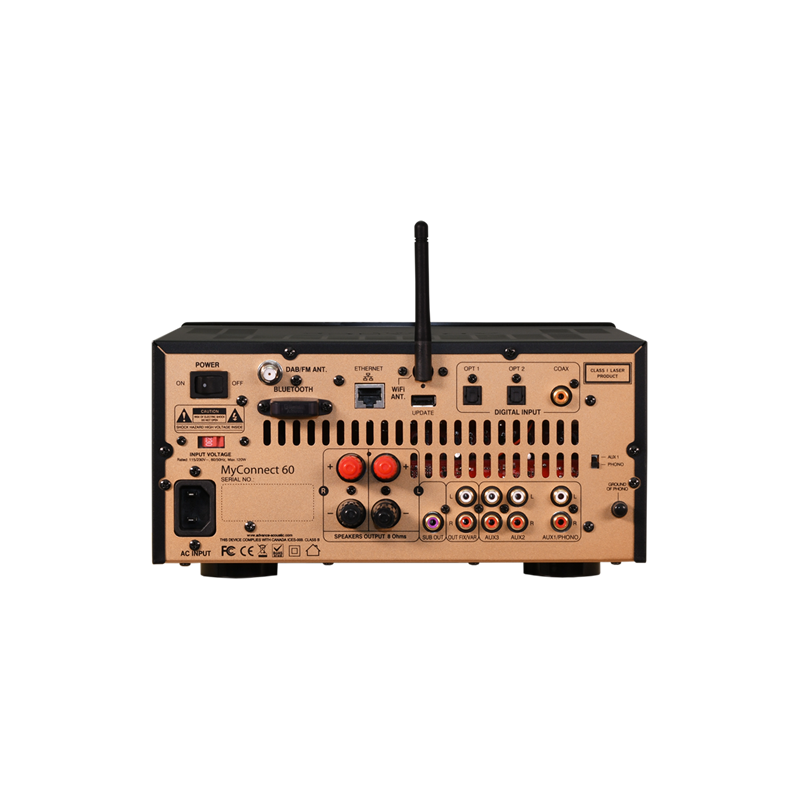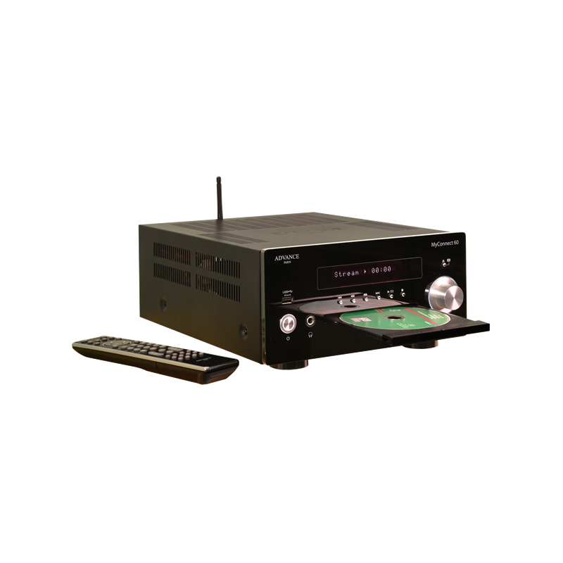 El MyConnect 60 es un audiófilo todo-en-uno con un amplificador incorporado de 2x60W, un reproductor de red wifi y ethernet, un sintonizador DAB+ / FM, un reproductor de CD, un lector USB y un receptor Bluetooth.