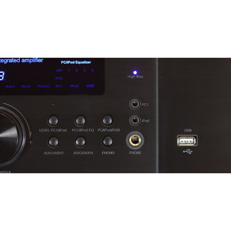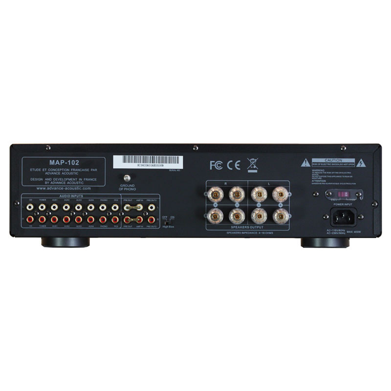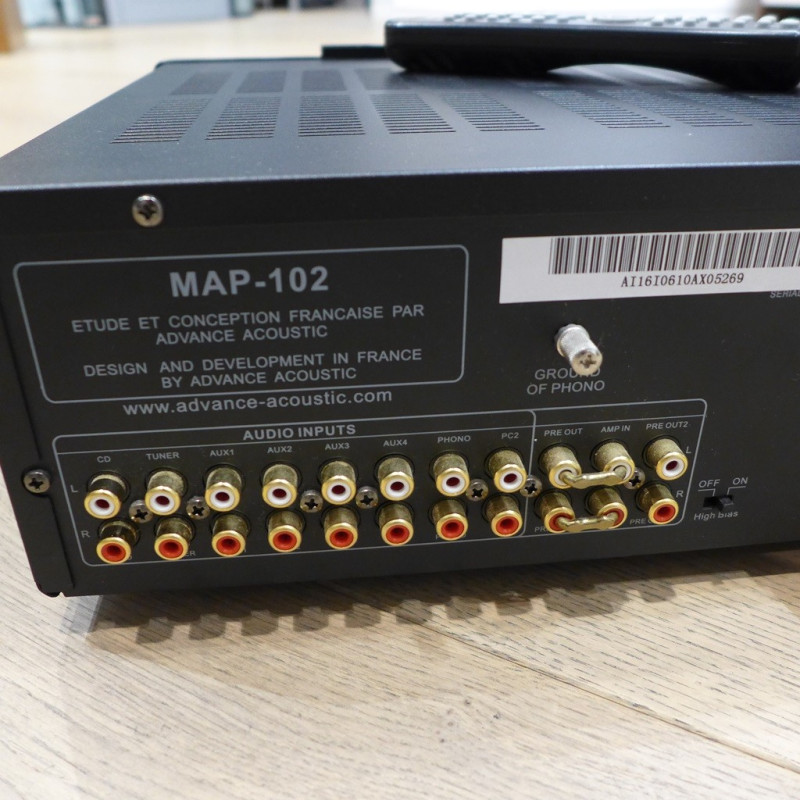 Amplificador Advance Acoustic MAP102. Completo amplificador que incorpora casi todo lo que puede tener un amplificador. Puede funcionar en clase A o AB, se conmuta automaticamente. Posee cuatro ecualizaciones para las entradas de iPod y USB. La calidad de sonido es muy buena y la construcción la habitual de este fabricante, excelente. Amplificador integrado 2x80Watios. Entrada USB e iPod frontal!. MDistancia. High Bias. 2x16W Clase A. 500-279