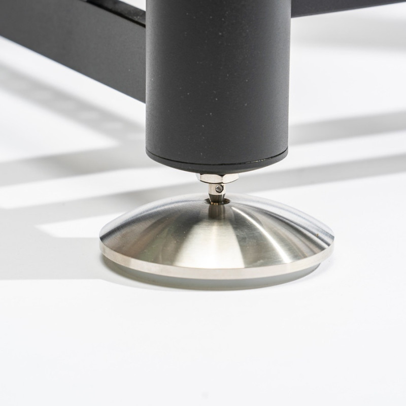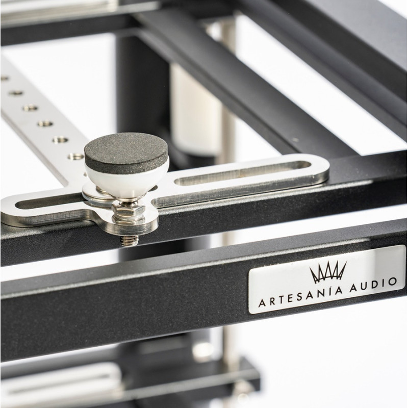 agujas de acero apoyadas en discos aislantes. Estos proporcionan niveles extra de protección anti resonante. Este rack de audio suspendido tiene un triple desacoplamiento.