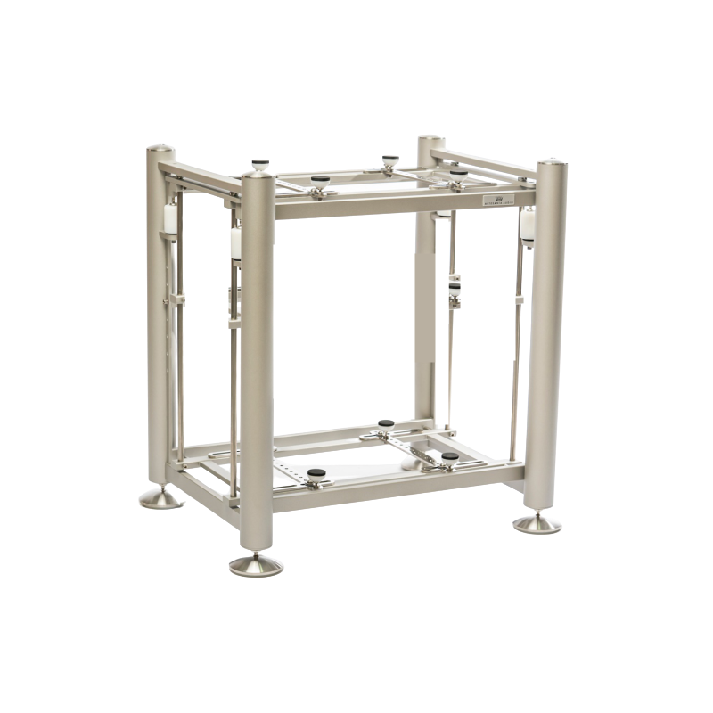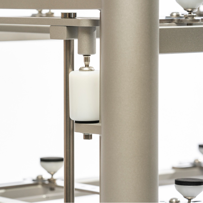 Aislado de la estructura externa. Elimina las vibraciones que se transmiten de fuentes sólidas y acústicas mediante la creación de desacoplamientos; agujas de acero apoyadas en discos aislantes. Estos proporcionan niveles extra de protección anti resonante. Este rack de audio suspendido tiene un triple desacoplamiento.