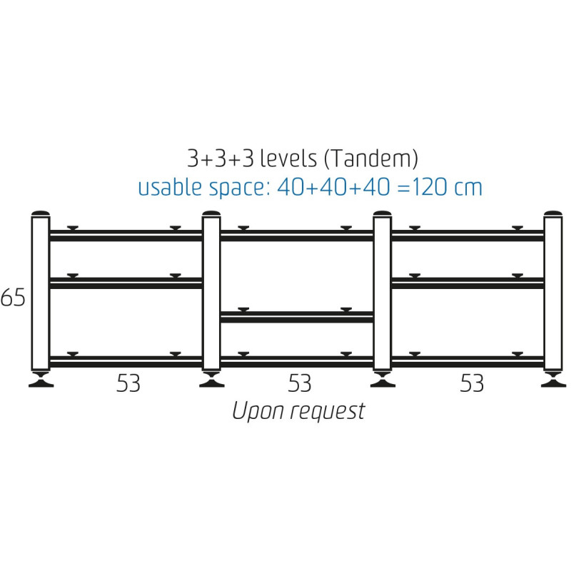 Estos marcos son ajustables en altura para colocar correctamente cualquier tamaño de componente. Se fijan en las barras verticales de acero inoxidable de la estructura suspendida.