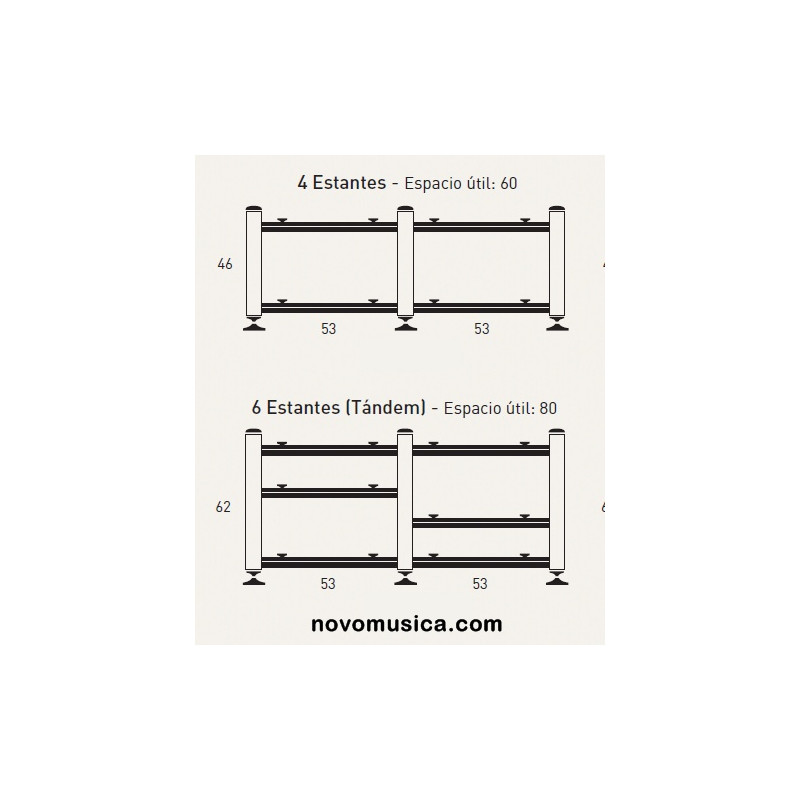 · Cuatro agujas de acero por cada estante, sobre las que descansan las almohadillas (Permite el máximo nivel de desacoplo y la calibración exacta de alturas y nivelación de las baldas).