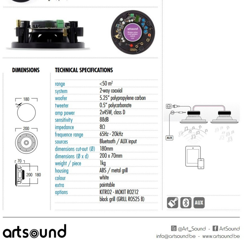 ArtSound FL 501BT Set Altavoces 2 vías Amplificado. Incorpora amplificador digital de 2x45W. Conexión Bluetooth y auxiliar, mini jack 3,5mm. Altavoz 2 vías 5,25” + Tweeter de 0,5” de policarbonato. Máx. 70W, 92dB, 8Ω.Respuesta de frecuencia 85Hz-20kHz. Formato rejilla redondo.