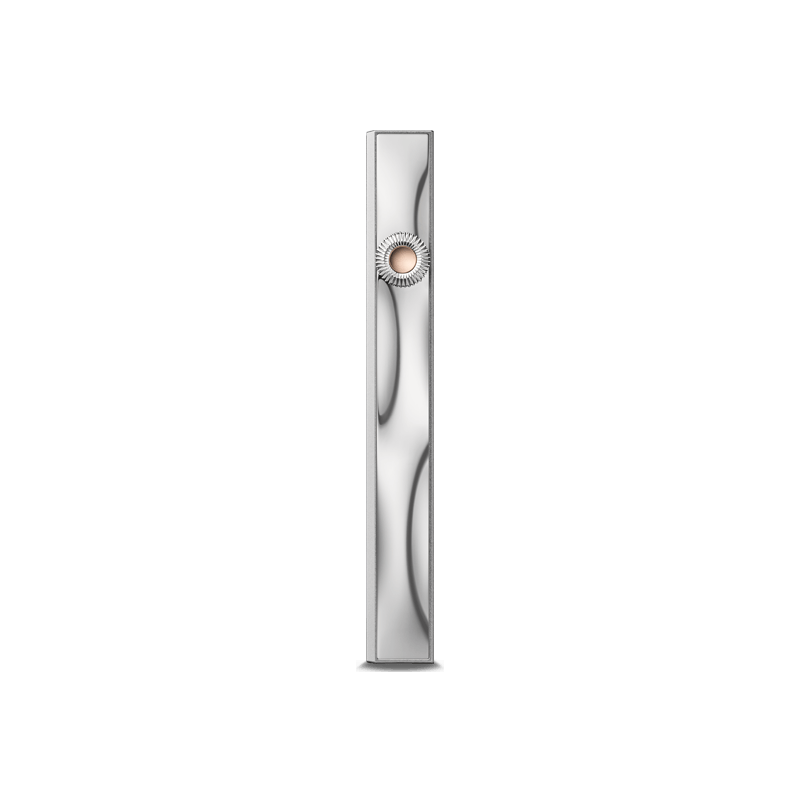 El cuerpo principal de aluminio tiene superficies aerodinámicas que representan el flujo de la música. De este modo, creamos una imagen firme pero flexible. Añadimos intensidad utilizando materiales contrastados, como acero inoxidable y cristal, para realzar aún más el tema de la "corriente". Además, la parte inferior del aparato se curva hacia fuera, lo que permite un agarre más ergonómico mientras se utiliza el reproductor.