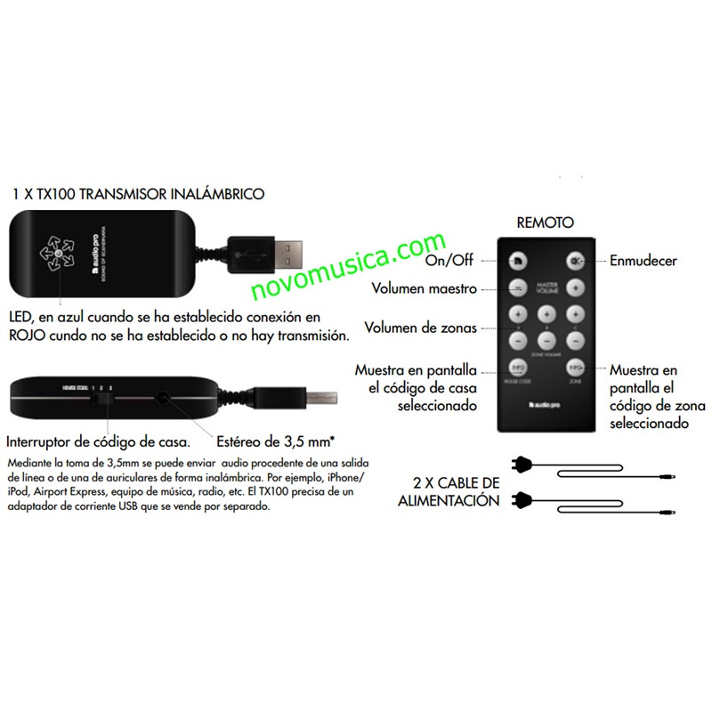 Para que el envío de señales sea posible se incluye un emisor llamado AudioPro TX100 que puede enviar señales desde un ordenador por medio de USB o la otra opción es que incluyen en un lateral una entrada mini-jack donde se puede conectar un lector de CD, la salida de auriculares de un TV, MP3 o teléfono móvil. Cualquiera de las dos opciones es válida ampliando de esta manera las posibilidades de uso.