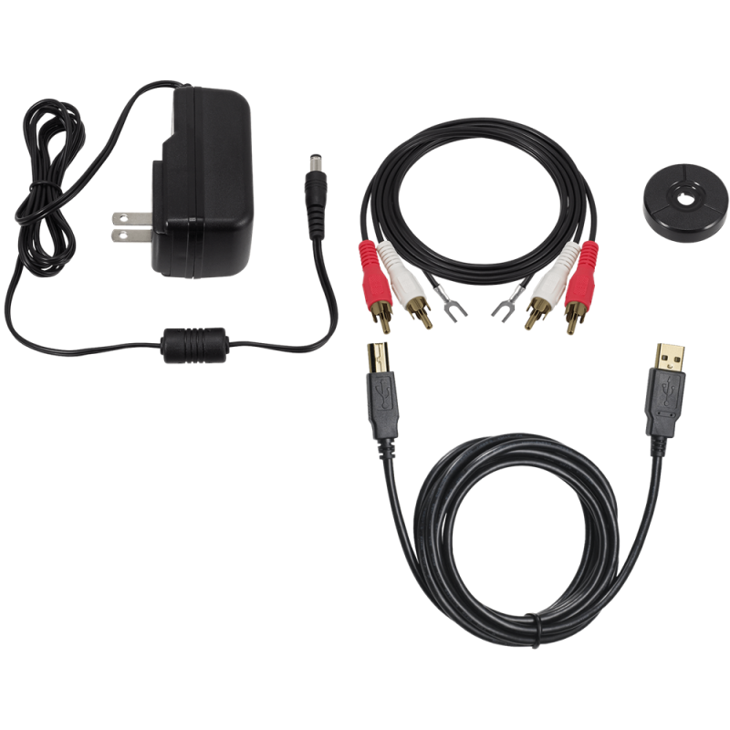 • Incluye: cable USB, cable de salida RCA desmontable (macho RCA doble a macho RCA doble), adaptador de CA, adaptador de 45 rpm,contrapeso, alfombrilla de fieltro y cubierta anti-polvo desmontable