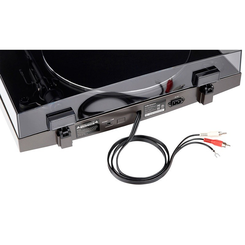 En la parte posterior del AT-LP2X hay un interruptor PHONO/LINE; un cable de salida dual-RCA conectado; y una entrada AC para conectar el cable de alimentación incluido. Dependiendo de su configuración, cambie el interruptor PHONO/LINE a LINE cuando utilice el AT-LP2X con un preamplificador estéreo, o a PHONO -que encenderá el preamplificador interno- cuando lo conecte directamente a los altavoces.