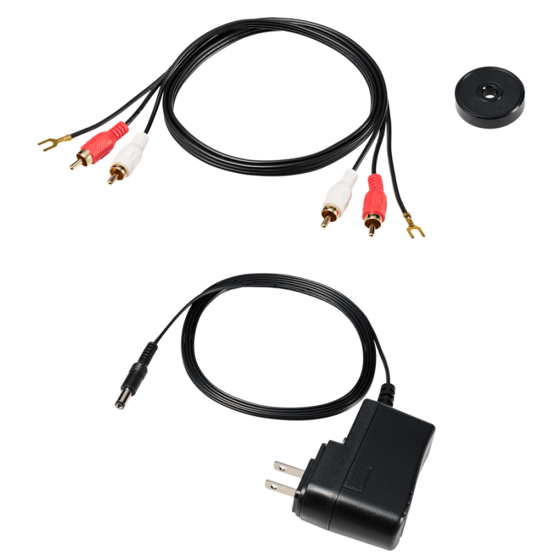 Incluye un cable estéreo RCA dual (macho) a RCA dual (macho), un adaptador de 45 rpm, una alfombrilla de goma y una cubierta antipolvo con bisagra extraíble.