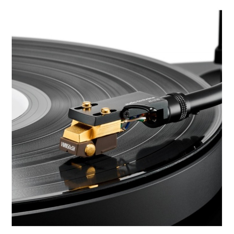 La nueva y ligera aguja Shibata del AT-VM750xSH proporciona un mayor contacto superficial con el surco del disco que una aguja elíptica, lo que se traduce en la captación de frecuencias ultraaltas con un mínimo de abrasión y distorsión. Esta reproducción de audio rica en matices se ve reforzada por la adopción de un cantiléver de boro macizo, que transmite las señales unas 2,5 veces más rápido que el conducto de aluminio del modelo anterior, lo que se traduce en una reproducción más precisa de los pasajes musicales dinámicos.