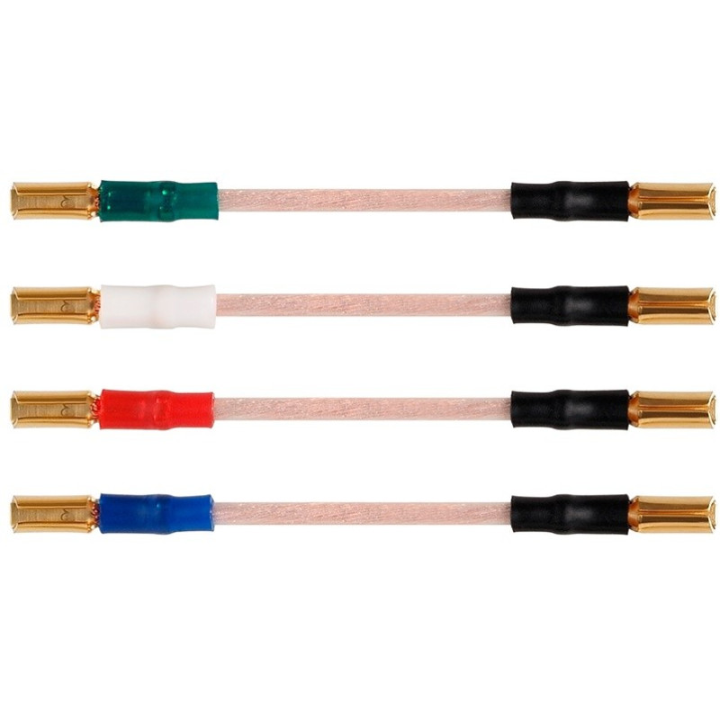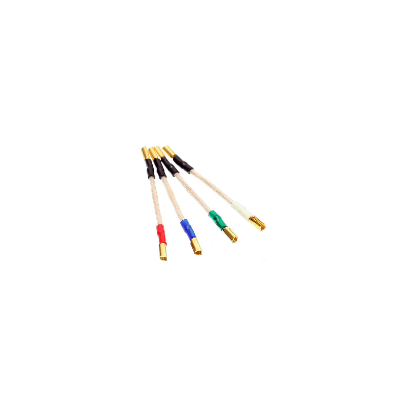 Cables de plomo codificados por colores para conectar un cartucho phono a un casco telefónico. 6N-OFCC 99,9999% cobre de alta pureza libre de oxígeno; 0,12 mm x 29 hilos de construcción.
