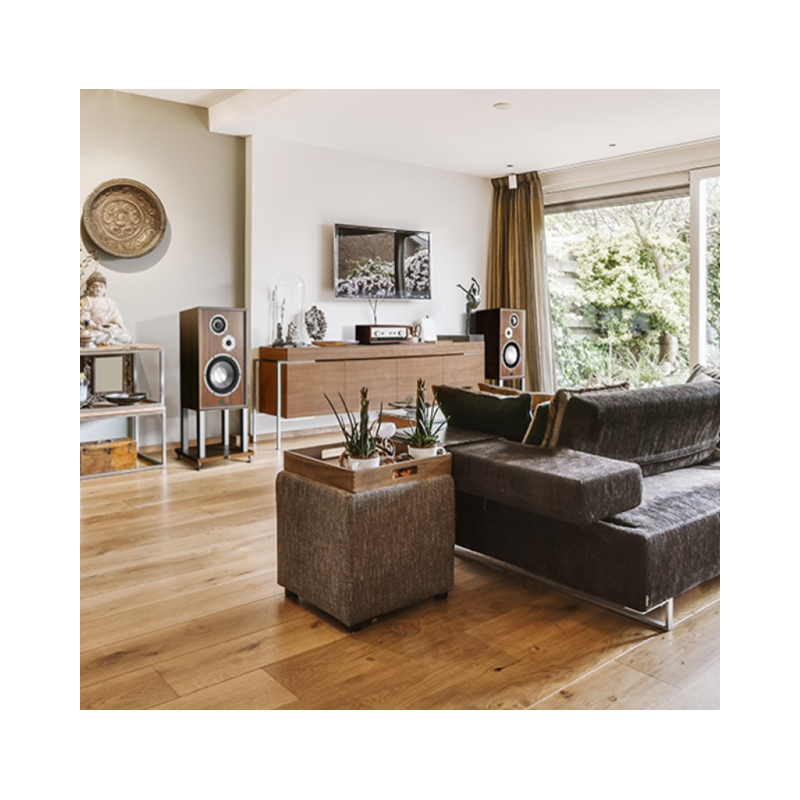 Sus conos de acero para desacoplo del suelo pueden regularse para permitir un perfecto equilibrado y asentamiento. Sii tiene un suelo delicado (parquet,...), estos soportes incluyen bases contra-puntas a juego que impedirán que se dañe.