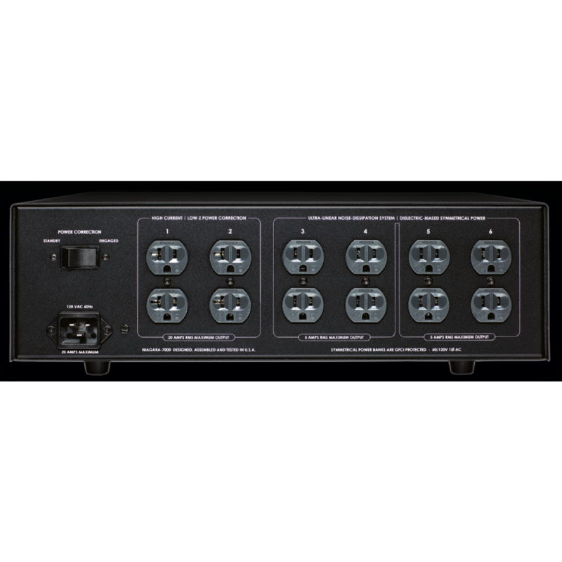 El Niagara 7000 utiliza nuestro sistema patentado de disipación de ruido en tierra de CA, los primeros transformadores de aislamiento de CA con polarización dieléctrica del mundo y el circuito de disipación de ruido linealizado de mayor ancho de banda de la industria. Nuestro exclusivo Circuito de Corrección de Potencia Transitoria Pasiva/activa cuenta con un depósito de corriente instantánea de más de 90 amperios de pico, diseñado específicamente para los amplificadores de potencia sin corriente de hoy en día. La mayoría de los productos de alimentación de CA que cuentan con "salidas de alta corriente" simplemente minimizan la compresión de la corriente; el Niagara 7000 lo corrige.