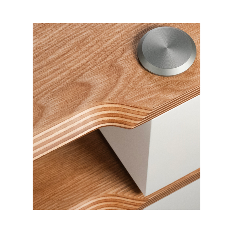 Stax 2G está disponible con dos tipos de estantes. Los clientes pueden elegir entre un elegante estante de cristal templado, acabado en negro, o un moderno estante de madera contrachapada, disponible en chapa de fresno natural o negro.