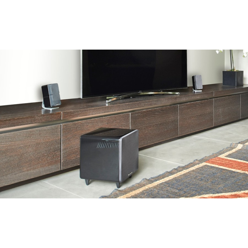 Las dimensiones (28 cm de lado, 11 pulgadas) de este dispositivo extraordinariamente potente (300 W) son mucho más reducidas que las de los subwoofers habituales. Sin embargo, gracias a un woofer activo de 8 pulgadas y un radiador de graves auxiliar, la unidad hará que tu música y sus películas ganen una viveza extraordinaria y una