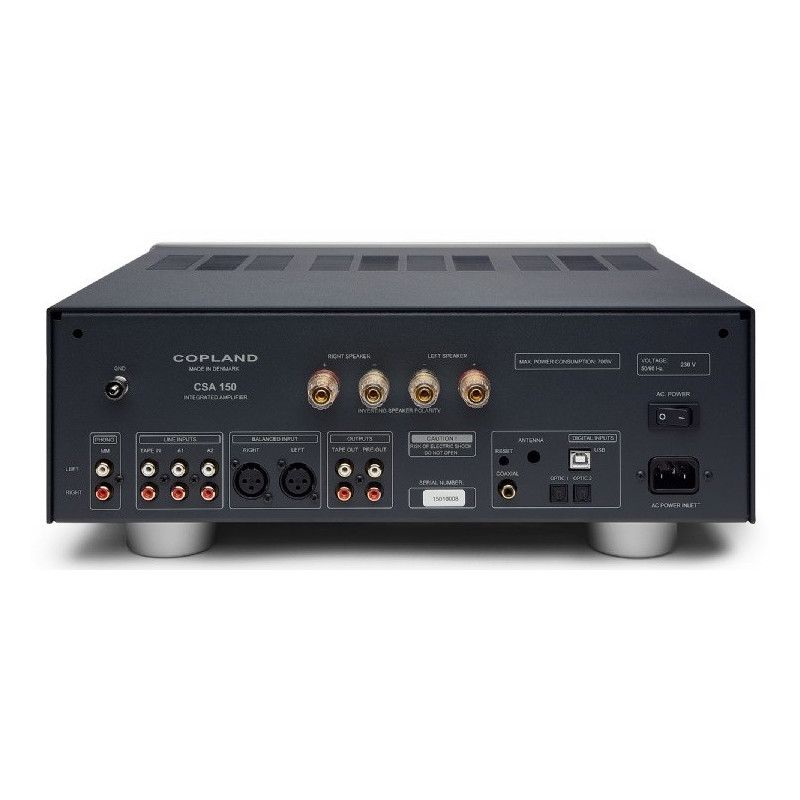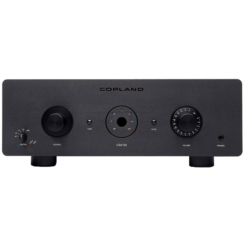 Copland CSA150 Amplificador 150 Watios | Construcción híbrida de válvulas y transistores, sección previo con doble triodo 6922 | DAC integrado de 8 canales y 32 Bits - Coaxial, Optica y USB | Entrada de PHONO para tocadiscos | Entradas RCA y XLR