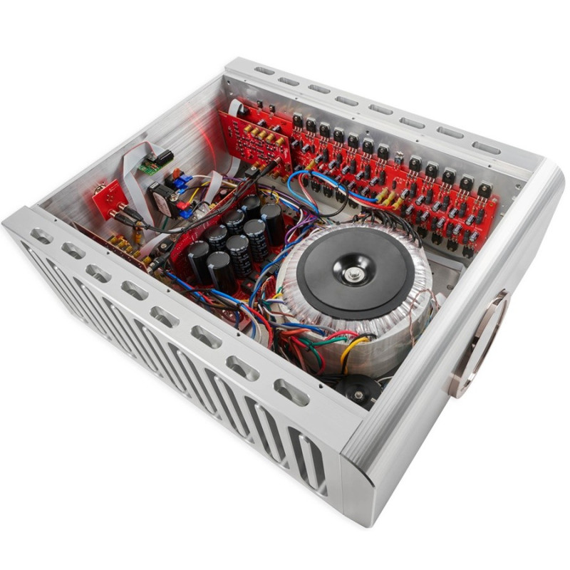 Cada amplificador emplea un raíl de tensión, en realidad dos, uno positivo y su compañero negativo. Los raíles de tensión soportan la entrega de potencia al altavoz. La señal musical oscila entre estos dos raíles, pero debido a las pérdidas naturales, la señal musical nunca alcanza la capacidad total de los raíles de salida. Nuestro Super Rail supera esta limitación. Tomando prestada la idea de un turbo en el motor de un coche, el Super Rail emplea rieles de mayor voltaje en las secciones anteriores a la etapa de salida. Este "refuerzo" de tensión permite que la señal musical aproveche toda la capacidad de los carriles de tensión de salida. Al extender la oscilación de la señal musical más cerca de los raíles de salida, se maximiza el rendimiento del propio diseño del circuito de salida. El resultado es una dinámica mejorada, una distorsión más baja y un agarre feroz del altavoz.