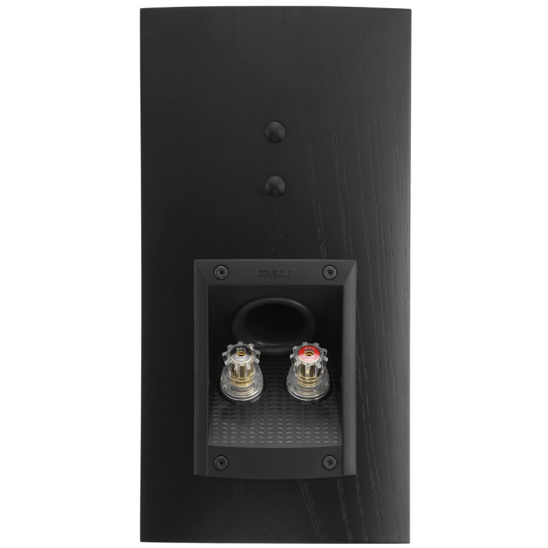 Esta disponible en dos acabados, cerezo y negro. Es un altavoz de dos vías con un par de terminales de conexión. El altavoz de graves es de 5 pulgadas y el altavoz de agudos es de cúpula de 28 mm. Todos los altavoces de Dali tienen indicado el lado al que deben situarse, izquierdo o derecho, y así conseguimos la espectacular escena sonora que crea esta marca.