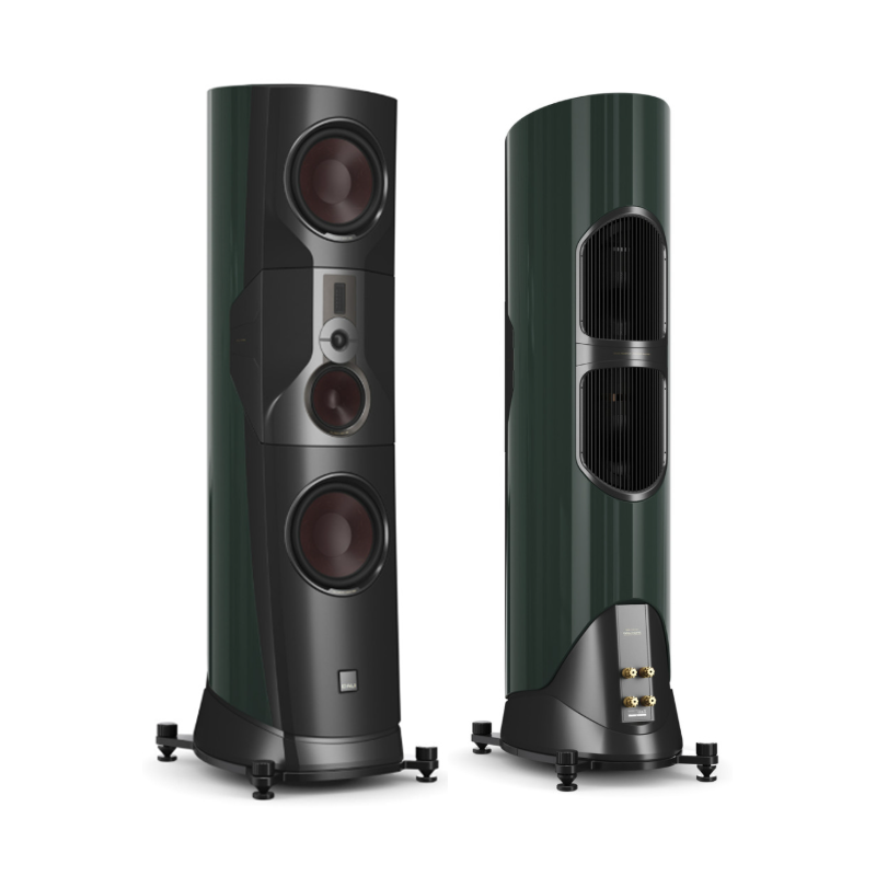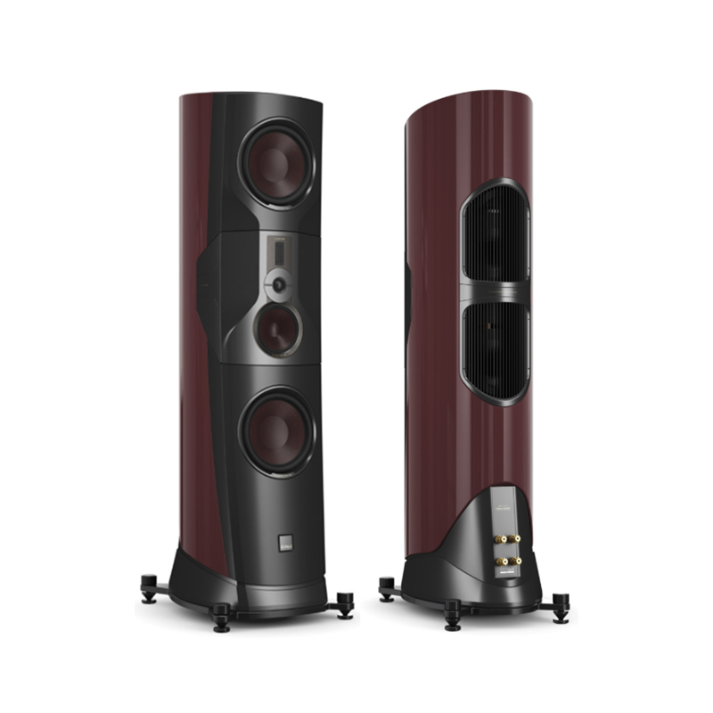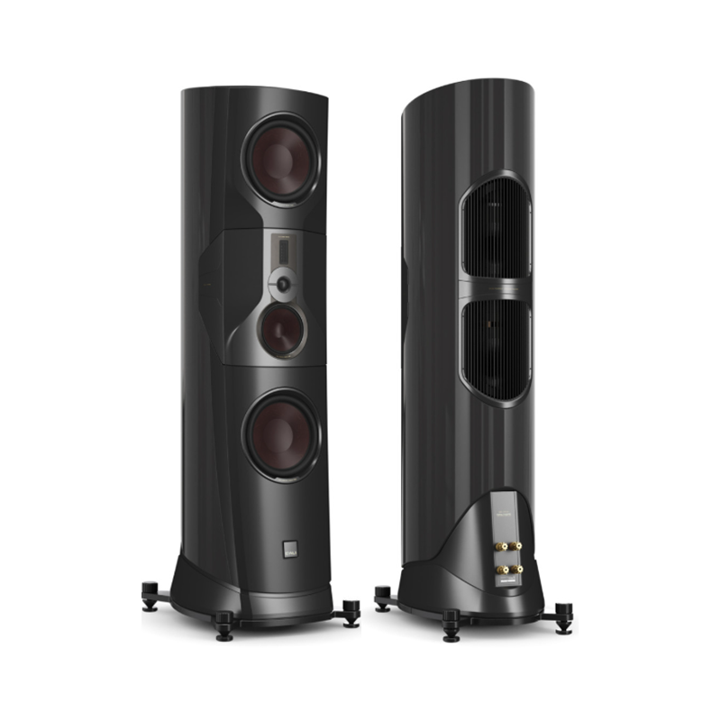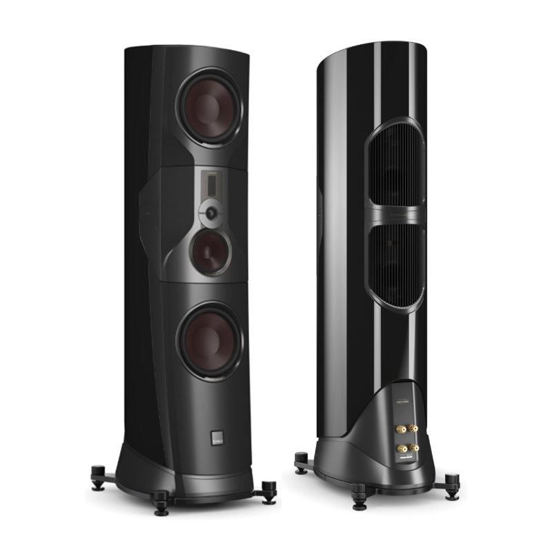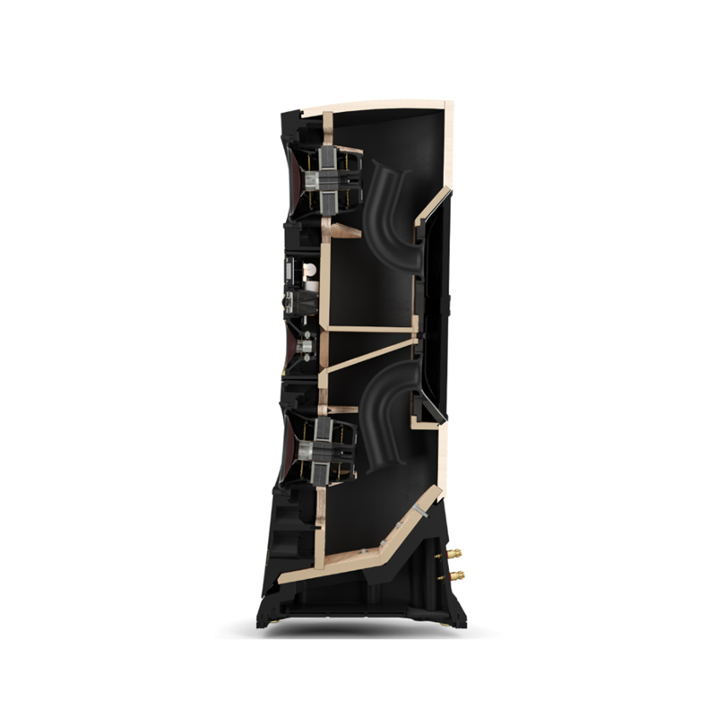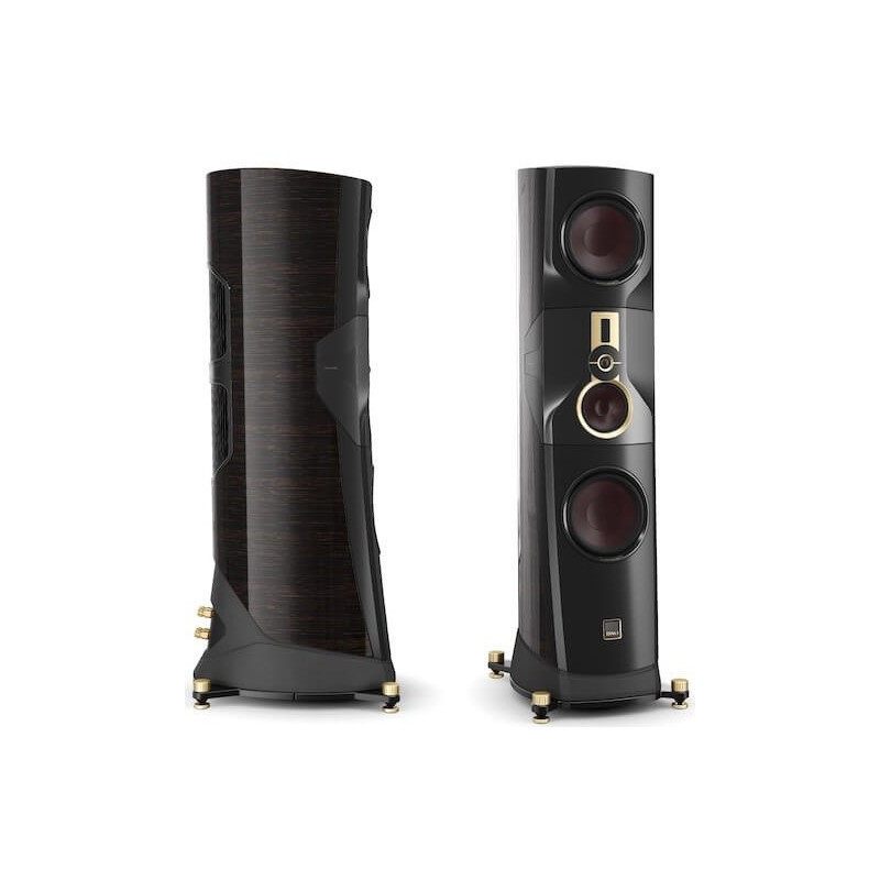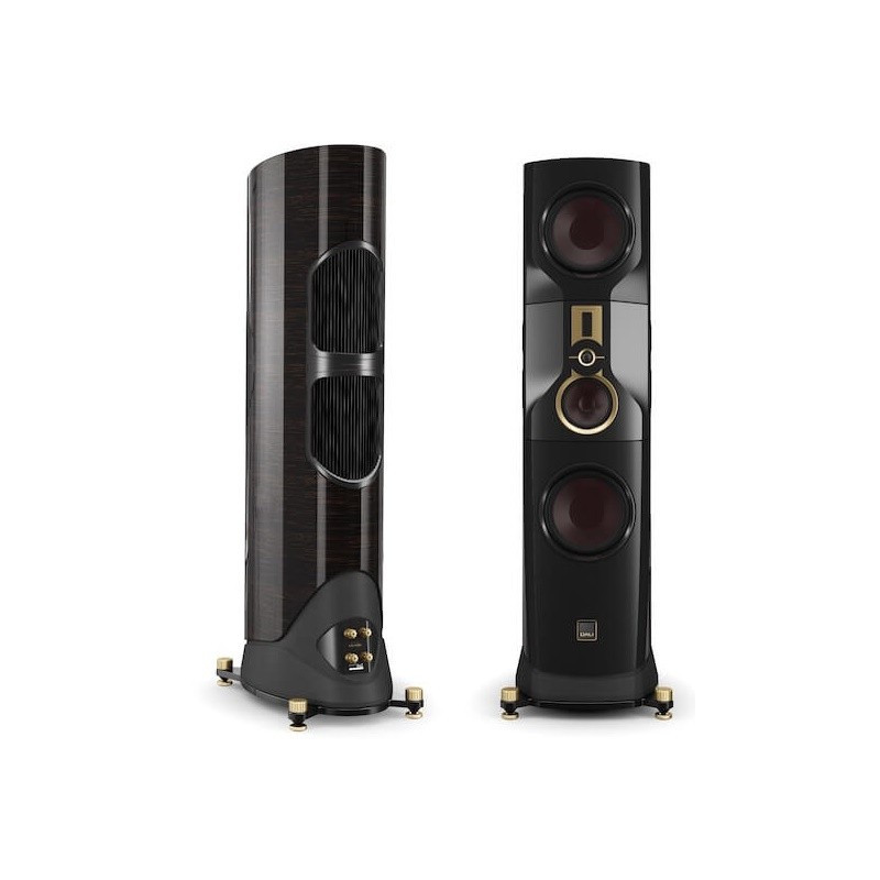 En un modelo insignia la estética también es importante. Por eso las DALI KORE están vestidas de gala con acabado barniz Ébano Amara, que resalta sus atractivas curvas. Como toque de distinción, los refuerzos de aluminio mecanizado en color dorado.