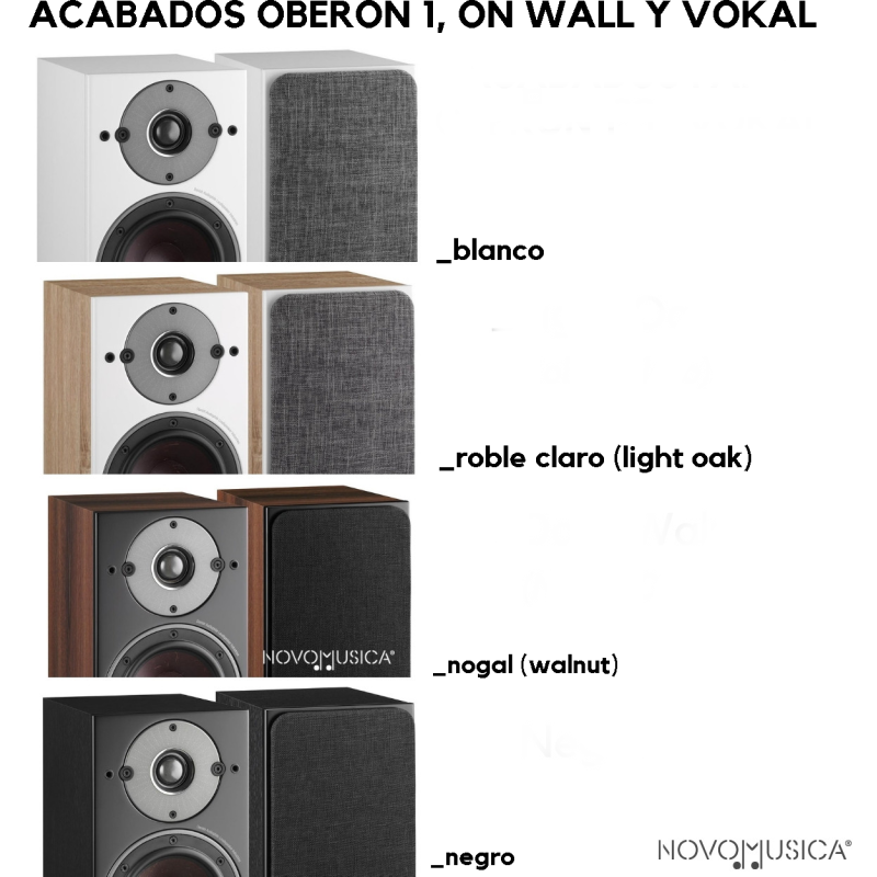 Disponible en color Negro o Nogal. Oberon Vokal y Oberon 1 también en color Blanco o Roble claro. Subwoofer en color Negro o Blanco.