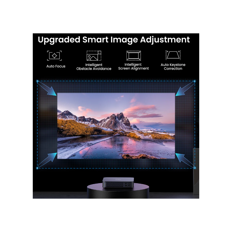 Configuración ultrarrápida: Funciones inteligentes como el enfoque automático, la corrección trapezoidal, el ajuste de pantalla y la prevención de obstáculos garantizan una imagen nítida, rectangular y perfecta en cuestión de segundos.