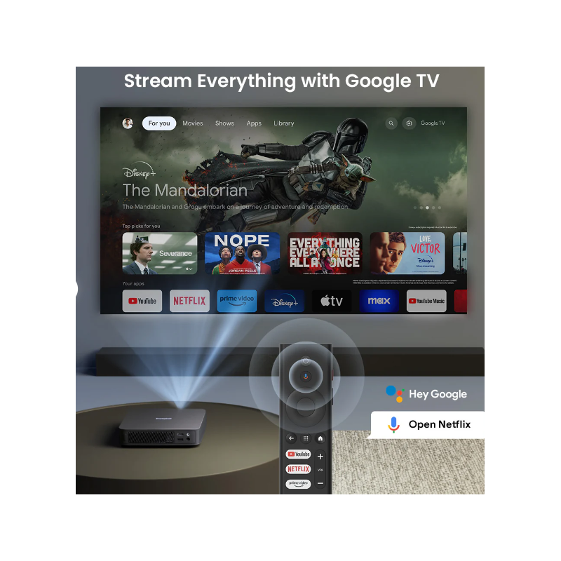 Ejecutando Google TV, el proyector láser Dangbei Atom proporciona acceso a más de 400.000 películas y series a través de aplicaciones como Netflix, YouTube, Prime Video y Disney+. Permite crear perfiles personalizados y ofrece control por voz a través de Google Assistant. También es compatible con Chromecast y AirScreen para compartir la pantalla de forma inalámbrica desde smartphones y tablets.