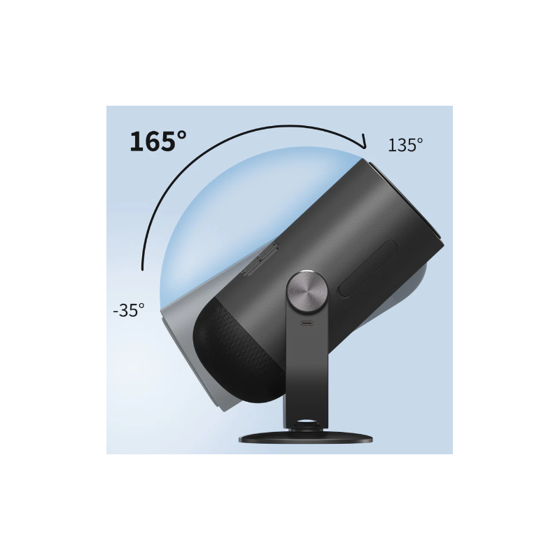 Freedo tiene un formato compacto y ligero de 1,4 kg, inspirado en un termo para facilitar su manejo. Sus dimensiones de 131 x 109 x 239 mm facilitan su transporte, y su soporte de cabeza de trípode integrado permite una inclinación flexible de -30° a +135°, ideal para proyectar desde la pared al techo.