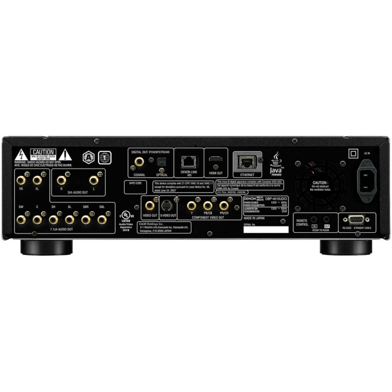 Universal Blu-ray disc player, to enjoy a wide variety of discs from your existing library in high sound and picture quality The DBP-4010UD lets you enjoy not only Blu-ray discs and DVDs but also a wide variety of other discs in your library, such as Super Audio CDs, DVD-Audio discs and CDs, in the splendour of high-quality sound and video. This level of quality is made possible with Denon's vibration-resistant technologies such as Direct Mechanical Construction and Multi-layer Chassis Structure, and superior audio and video circuit performance is the result of Denon's newlydeveloped S.V.H. mechanism that reads signals from the disc with impeccable precision. The audio circuitry features Advanced AL24 processors for all channels to achieve superior sound quality, while the video circuitry incorporates a high-bit-rate video processor to give you realistic video images. Since the DBP-4010UD is also equipped with DENON LINK 4th to thoroughly minimize jitter during HDMI transmission, you are given the best possible performance in sound when combined with a Denon A/V receiver*1).