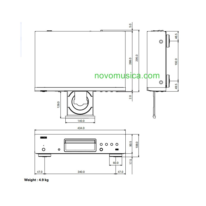 Las medidas son Ancho 435 x Alto 108 x Fondo 296 mm y peso de 4,9 Kgs