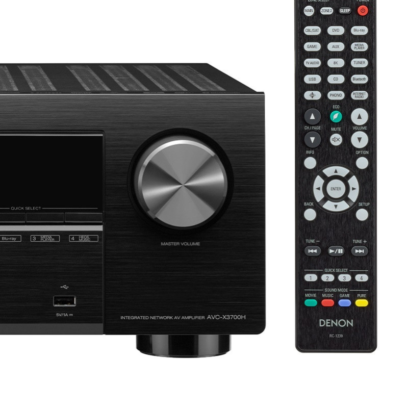 El panel frontal del Denon AVC-X3700H cuenta con cuatro botones de selección rápida que almacenan sus ajustes de audio preferidos para cada fuente. Cambia entre audio de TV, Blu-ray, reproductores multimedia y más, y el AVC-X3700H ajusta la configuración del ecualizador a tus preferencias para esa fuente multimedia. Utiliza los botones del panel frontal u opta por la misma Selección rápida del mando a distancia del amplificador AV para un control más rápido.