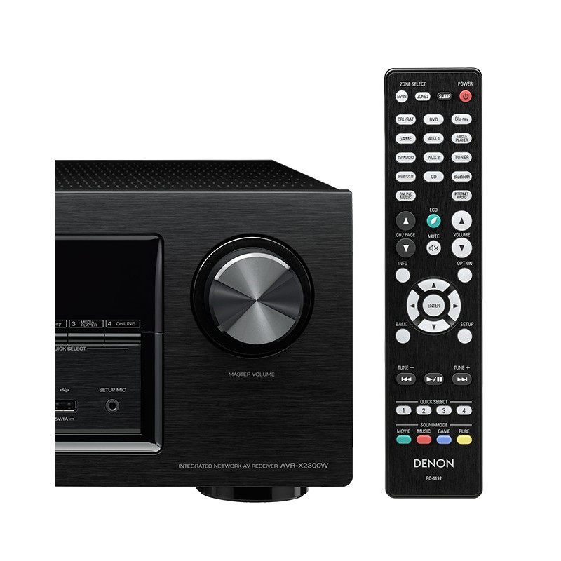 Denon fué el primer fabricante de receptores A / V en utilizar los avanzados algoritmos de audio DSP de Audyssey, Denon ha presentado el mayor número de productos equipados Audyssey, y el AVR-X2300W cuenta con la suite de plata Audyssey de funciones DSP, que incluye MultEQ XT, Dynamic EQ y Dynamic Volume . Los ajustes afectan a la acústica del sistema de medición y la corrección automática de la habitación. MultEQ XT hace coincidir los parámetros de los altavoces y la acústica de la sala. MultEQ XT proporciona una mayor precisión de filtro para todos los altavoces, con 8 veces la resolución en comparación con el sistema MultEQ base, en un máximo de 8 puntos de medición. Audyssey Dynamic EQ utiliza algoritmos avanzados psicoacústicos para ajustar continuamente el equilibrio tonal para que el sonido que se escucha sea la gama completa, incluso a niveles de volumen más bajo Audyssey Dynamic Volume suaviza volumen. Con la función Zone 2 podrá disfrutar del sonido estéreo de una fuente en una habitación, y sonido envolvente 5.1 de otra fuente en la habitación principal. Sólo tiene que conectar un par de altavoces estéreo a las salidas múltiples habitaciones amplificados. O conectar un amplificador estéreo y altavoces separados a la zona 2 salidas de preamplificador, y disfrutar del completo sonido envolvente de 7 canales en la sala principal. Los terminales de altavoz de alta calidad cuentan con la capacidad de conexión de múltiples vías para manejar una amplia variedad de tipos de terminación de cable del altavoz. Son también de un código de color para la conexión correcta la primera vez, y se incluyen las etiquetas de cable de altavoz codificados por colores. El práctico puerto USB en el panel frontal le permite transmitir canciones directamente desde tu iPod touch, iPhone y iPad y cargar su dispositivo al mismo tiempo. También puede conectar una unidad USB o dispositivo NAS y escuchar archivos MP3 y WAV en el AVR-X2300W, los archivos de alta resolución incluyendo DSD (2,8 MHz) y decodificación sin pérdidas FLAC son compatibles. Hay cuatro selecciones rápidas con botones de función del panel frontal y del mando a distancia ergonómico, que le permiten llegar a sus fuentes favoritas rápidamente. Y la función de selección rápida recuerda la configuración de audio preferidos para cada uno.