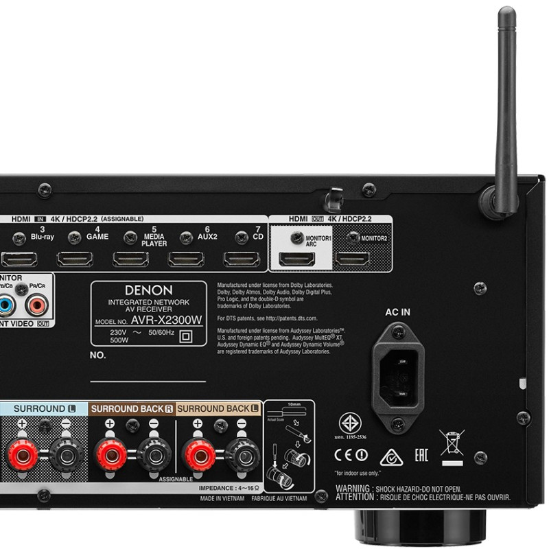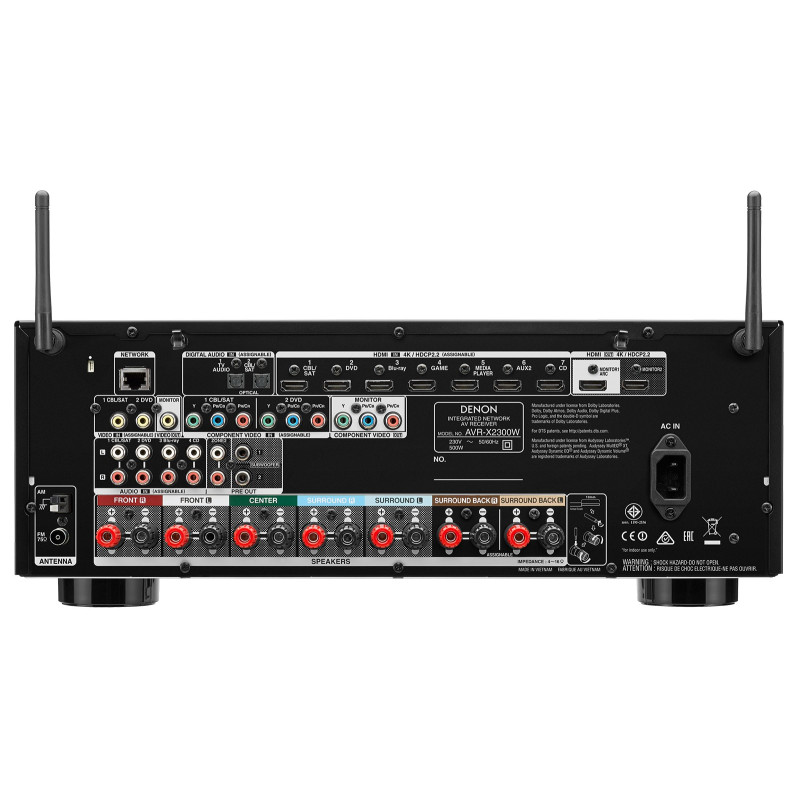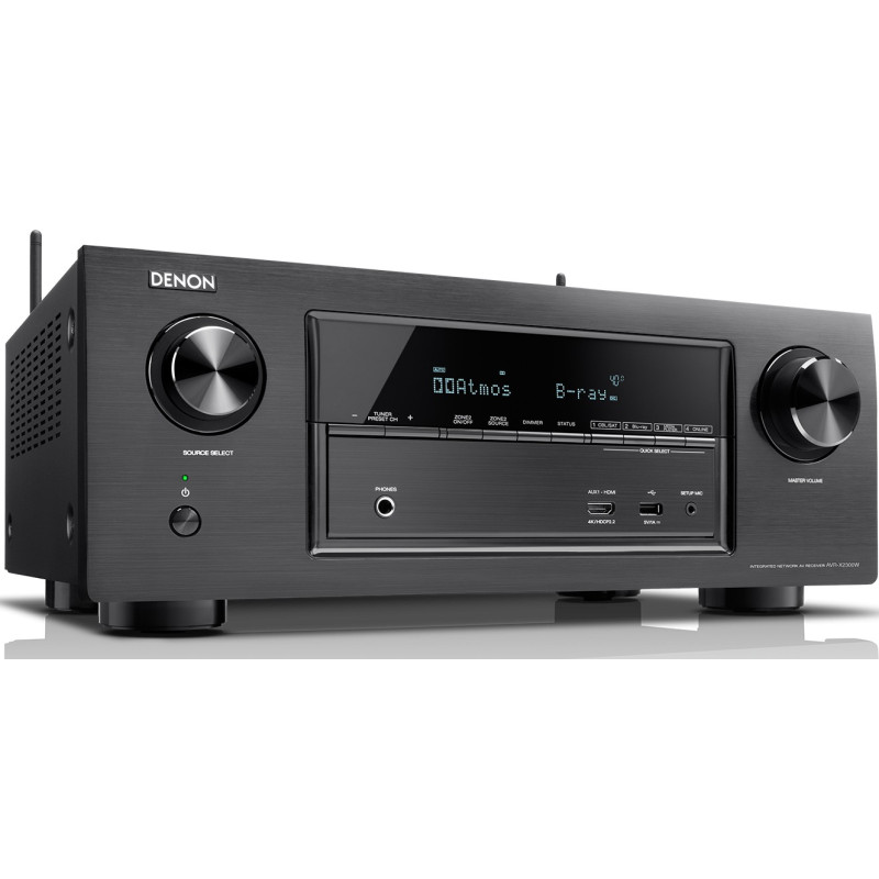 Denon AVR-X2300W Amplificador cine en casa. Este es un receptor de 7.2 canales compatible con 4K Ultra, conexión de red, Wi-Fi y Bluetooth. Experimente lo último en sonido envolvente de cine en casa con 7.2 canales que cuenta con Dolby Atmos y que le envolverá con el sonido de las bandas sonoras de las películas más avanzadas de hoy en día. Con Dolby Atmos, experimentará el mismo sonido envolvente 3D