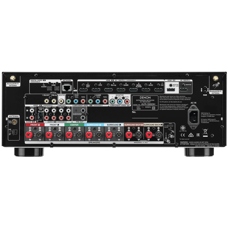 El AVR-S950H dispone de amplificadores de alta corriente independientes en todos los canales y, por lo tanto, es especialmente potente: 150 vatios por canal (6 ohmios, 1 kHz, distorsión del 1%). Los parlantes de baja impedancia proporcionan estabilidad funcional para muchos altavoces y un sonido equilibrado y completo. El AVR-S950H es compatible con Dolby Atmos, DTS:X y DTS Virtual:X y ofrece una gama HDMI con compatibilidad con HDCP 2.3 y procesamiento de vídeo avanzado con escalado de 4K para fuentes HDMI.
