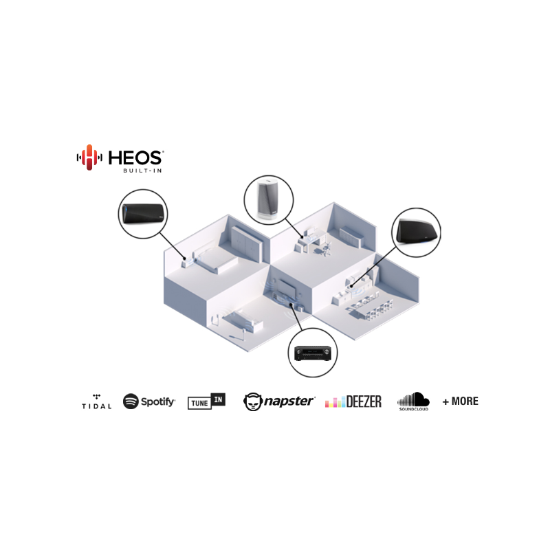 Con la tecnología HEOS integrada, puedes disfrutar de tu música favorita de forma inalámbrica en cualquier habitación de tu casa. Puede conectar el AVR-S950H a altavoces inalámbricos de altavoces compatibles con HEOS o HEOS para transmitir la música almacenada en su red doméstica. Disfruta de música de TuneIn, Internet Radio, Spotify®, Amazon Music, Soundcloud®, TIDAL, Napster y Deezer y mucho más. Controle todo a la perfección con la aplicación gratuita HEOS App.
