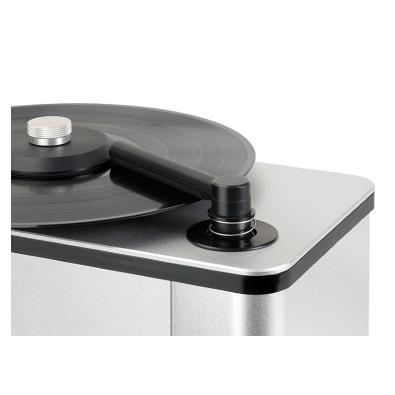 El proceso de limpieza es muy sencillo, sólo hay que activar el proceso de giro para realizar primero una limpieza previa en seco con el cepillo suministrado. A continuación, se rocía el disco con el líquido limpiador suministrado y se extiende ligeramente con el cepillo. A continuación, sólo se guía el brazo de aspiración sobre el disco, se activa la aspiración regulable y, tras 3-5 revoluciones, el disco está limpio. El líquido de limpieza se recoge en el depósito de 250 ml instalado internamente y, si es necesario, se puede vaciar con una manguera sujeta con abrazaderas en la parte trasera de la RCM-400.