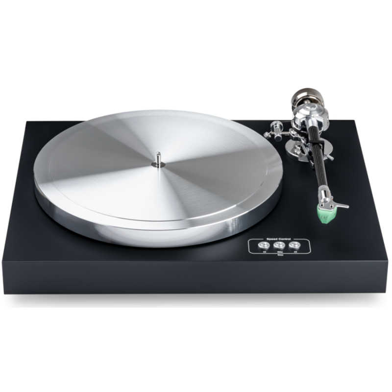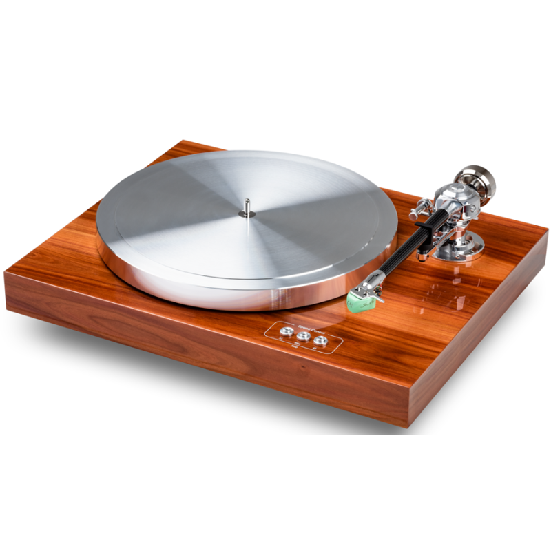 Partiendo de la idea de trasladar las excepcionales prestaciones del modelo Forte a un giradiscos de formato más compacto, el C-Dur es un lector de vinilos con tracción por correa que destaca en primer lugar por la extremadamente suave rotación, sin el más mínimo ruido de fondo, de su plato. Construido en aluminio y con un peso de 5’2 kg, dicho plato descansa sobre un “suplatter” de aluminio de 900 g libre de resonancias y se completa con un cojinete invertido que garantiza una reproducción silenciosa y precisa. Por su parte, el opulento bloque de giro combina un eje de acero inoxidable pulido con una bola de cerámica situada en su zona superior como consecuencia de su dureza e inercia extremas. A ello hay que sumar una placa de Teflon cuya superficie satinada contribuye a incrementar el nivel de amortiguamiento y la suavidad de la rotación. Otro componente clave del C-Dur es el brazo de lectura, concretamente el celebrado C-Note de EAT, un instrumento de alta precisión con longitud efectiva de 10” (254 mm) y cuerpo central de fibra de carbono que compagina todas las ventajas de los brazos unipivot con un diseño de tipo Cardan. En cuanto al motor, se utiliza un modelo de muy bajo ruido completamente aislado gracias a su colocación sobre un anillo de acero que a continuación es montado en el chasis del C-Dur.