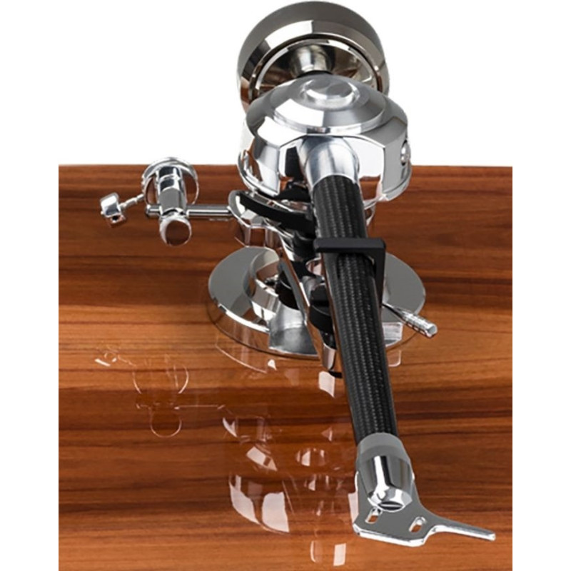 Brazo de lectura con tubo de fibra de carbono y portacápsulas de aluminio.