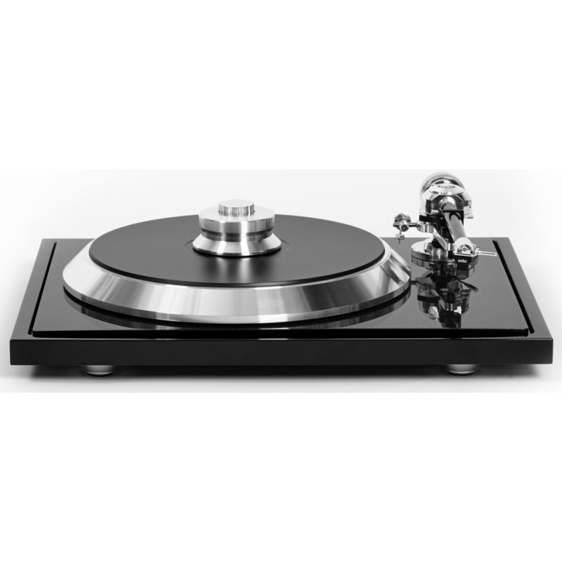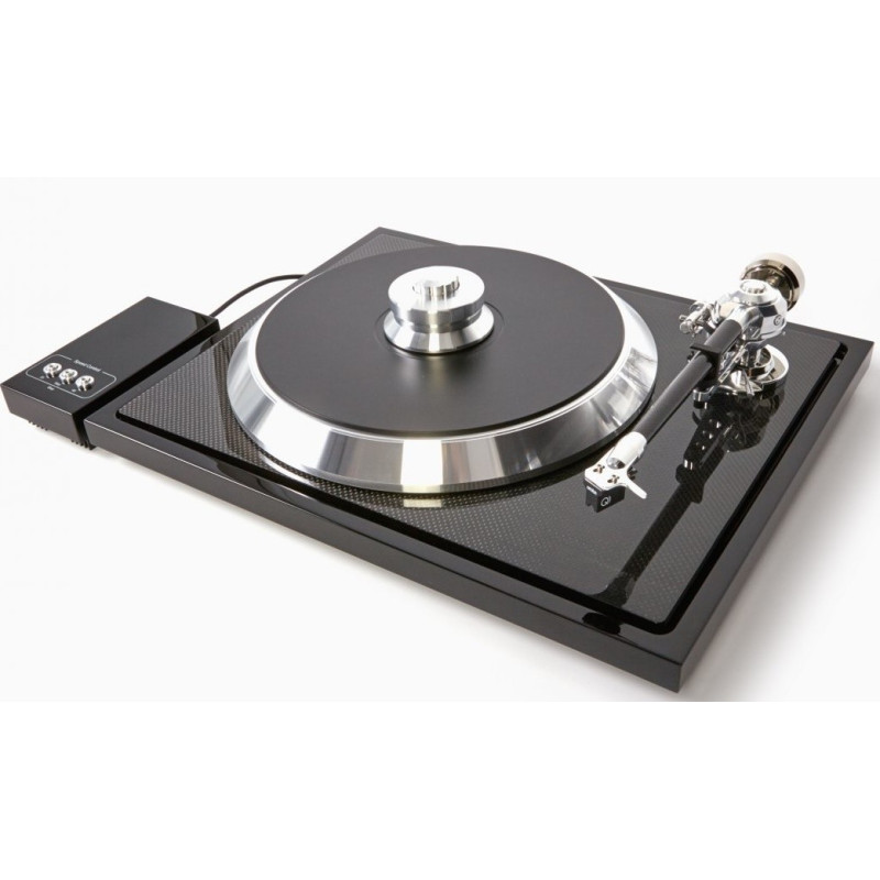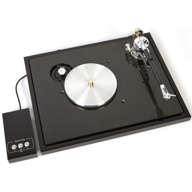 Consecuencia directa del gran éxito comercial del estilizado giradiscos E-Flat, el C-Sharp es un atractivo y rompedor giradiscos de referencia absoluta que eleva todavía más el listón en términos de perfil ultradelgado, elegancia estética y sofisticación tecnológica gracias al uso de nuevos materiales como la fibra de carbono y los cauchos o elastómeros termoplásticos. Así, el motor –un diseño con ruido de funcionamiento extremadamente bajo- es montado en el interior de un chasis ultradelgado fabricado en de MDF de muy alta densidad, a lo que se suman 10 sofisticados pies absorbentes de elastómero termoplástico. Por otro lado, las columnas en forma cónica de TPE soportan un subchasis de estructura sándwich que combina fibra de carbono y MDF para constituir el no va más en rigidez. En lo que concierte al crucial sistema de giro, el C-Sharp incorpora un eje sobredimensionado combinado con un cojinete de cerámica acústicamente inerte y libre de resonancias en su parte superior, configuración que, de nuevo, permite establecer un robusto -700 gramos- punto de masa con el fin de absorber toda la energía sobrante presente en los alrededores del conjunto. Del nuevo giradiscos de referencia de EAT también hay que destacar que utiliza una correa de goma antiestática especial, así como un absolutamente innovador brazo de lectura que combina todas las ventajas de uno de tipo unipivot con las de uno de tipo cardán. Señalemos asimismo que el C-Sharp es acompañado por una fuente de alimentación de corriente continua externa basada en un generador de corriente alterna que permite maximizar la limpieza de la señal enviada a los motores.