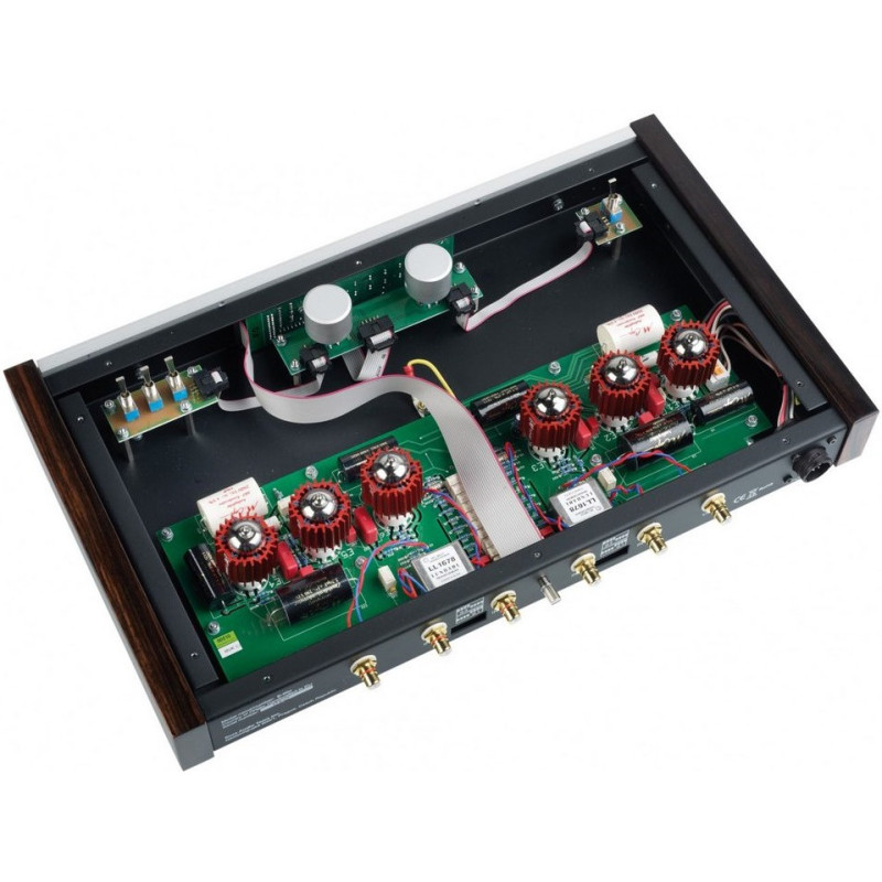 En la etapa de entrada totalmente equilibrada, instalamos un transformador elevador Lundahl con un núcleo amorfo, tipo LL1932. La ganancia de la unidad es de 45db, más la ganancia de voltaje del transformador elevador. La sección del amplificador de E-Glo utiliza una ecualización dividida, totalmente pasiva, sin ninguna ecualización en el bucle de realimentación negativa global, lo que puede dañar el sonido.