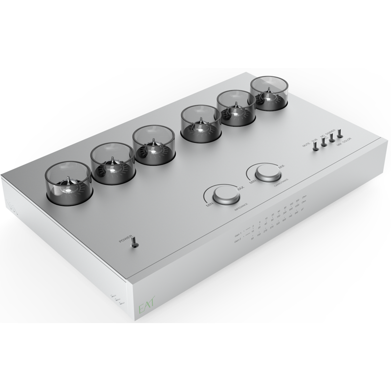 Renovación de un clásico del audio High End cuya versión original vio la luz por vez primera en el CES de Las Vegas de 2013, el E-Glo 2 de la centroeuropea EAT (“European Audio Team”) es un preamplificador de fono 100% a válvulas, lo que significa que la totalidad del trayecto recorrido por la señal de audio está libre de semiconductores. Su dotación de dispositivos de vacío consiste en una configuración muy apreciada por los audiófilos, concretamente cuatro ECC83 y dos ECC88, que es complementada por componentes pasivos de grado audiófilo rigurosamente seleccionados. Es el caso de los muy apreciados condensadores Mundorf con aislamiento de Teflon, elegidos por su integridad sin parangón, y también de sus homólogos de película de polipropileno empleados en el trayecto de señal y en la circuitería de ecualización pasiva. Asimismo, en la etapa de entrada, cuya arquitectura es completamente balanceada, encontramos un transformador elevador con núcleo amorfo LL1932 de la reputada Lundahl. El E-Glo 2, que incluye entradas balanceadas con conectores XLR para cápsulas de bobina móvil (MC), se completa con una fuente de alimentación externa equipada con un transformador toroidal doblemente blindado entre sus devanados primario y secundario, que permite evitar la intrusión de interferencias de radiofrecuencia (RFI) haciendo a la vez de filtro de red de alta calidad.