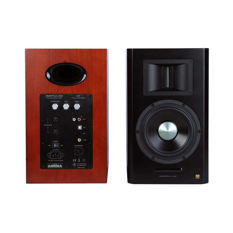 Los altavoces A300 combinan la calidad de un monitor de referencia y un estilo retro de madera en un altavoz de tipo monitor activo. La simplicidad unida a la calidad es nuestro lema con AirPulse. Conecte los altavoces entre sí con el cable de conexión y conecte el altavoz a su fuente de audio directamente con los cables incluidos. Estos altavoces se venden por parejas e incluyen un control remoto.
