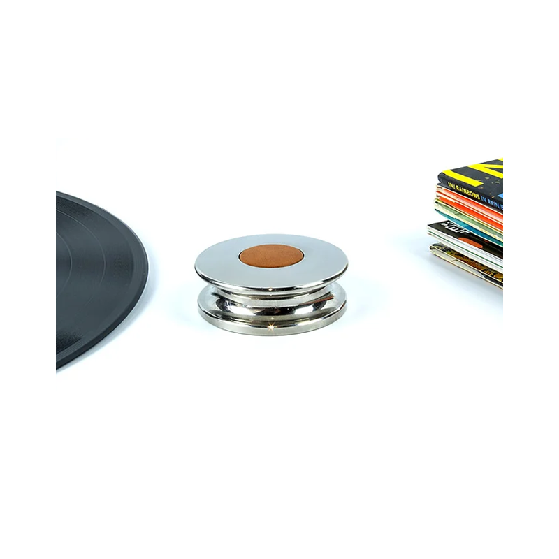 El estabilizador de Elipson elimina las vibraciones del vinilo sobre el plato. El peso aplicado por la estabilizador estabiliza el vinilo y limita la deformación a la que puede estar sometido.