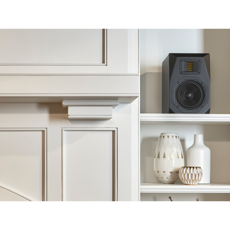 Airmotiv B1 es un altavoz de estantería de dos vías, con un 32mm Tweeter folded ribbon Airmotiv y un 5-1/4” woofer de fibra textil. Un par de monitores Airmotiv B1 pueden servir para un pequeño sistema estéreo de alta calidad, o un conjunto de cinco o siete componer una configuración estéreo en una estancia pequeña. Otra opción es usar una pareja de monitores Airmotiv B1 como altavoces de canal izquierdo y derecho, y combinarlos con Airmotiv E1’s para un sonido envolvente o sin Airmotiv E1 como un altavoz central de pared.