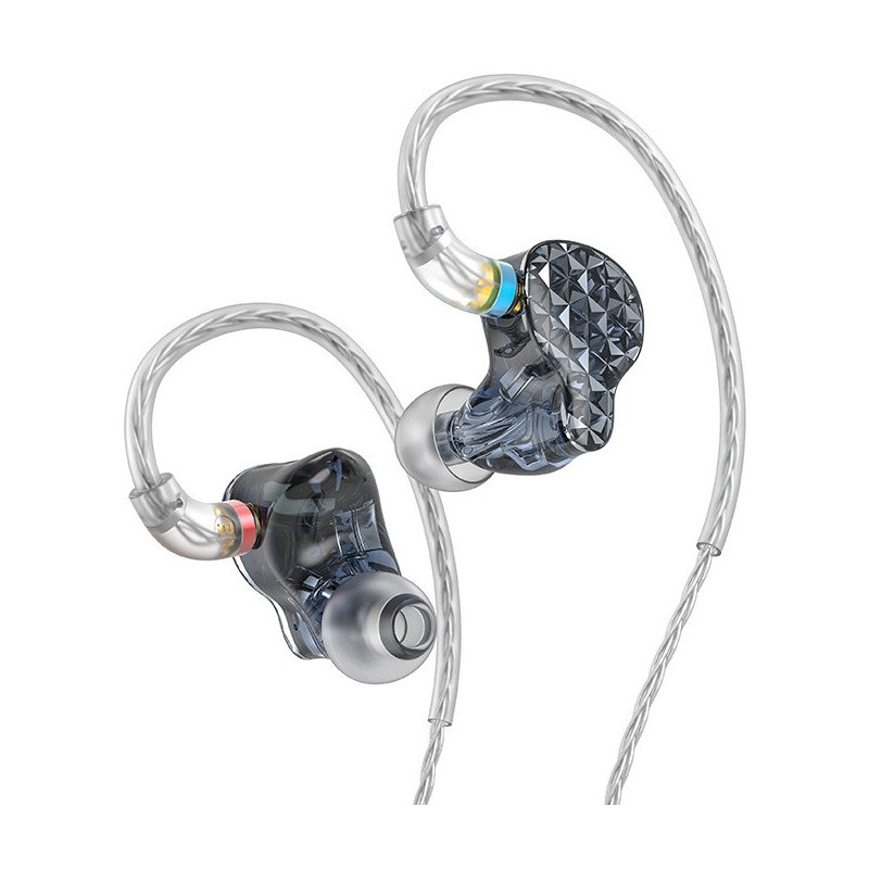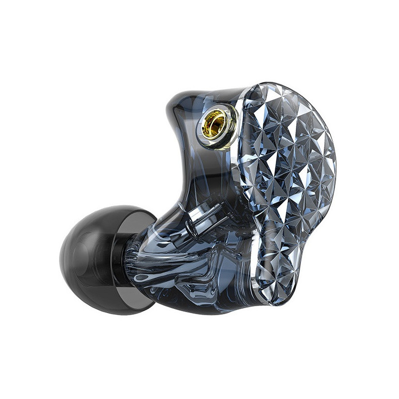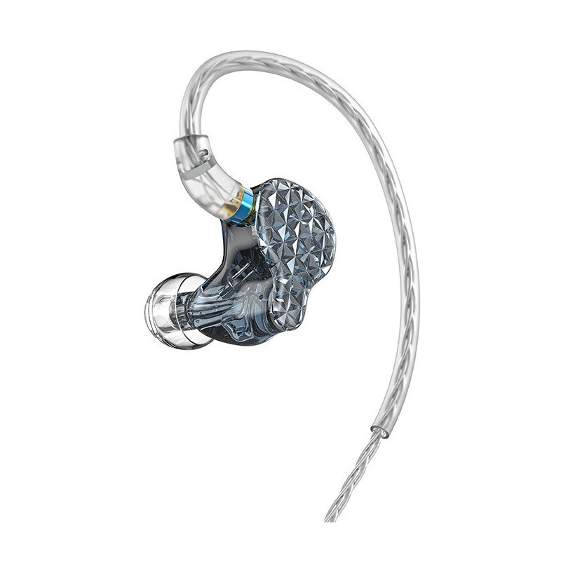 Para mejorar la estética, los auriculares integran una placa frontal con corte de diamante que se integra con la carcasa transparente de resina negra translúcida para una apariencia magnífica.