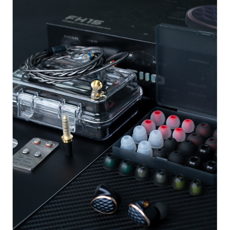 El auriucular intraaural - IEM - de 3 armaduras balanceadas y 1 transductor dinámico FH15# se desarrolló a partir de la acumulación de tecnología de los anteriores FH5 y FH5s. Tras más de 1.570 días de repetidas comparaciones y 3.780 horas de trabajo artesanal, conseguimos devolver a la verdad los IEM híbridos con un controlador dinámico estable de 1 y una arquitectura acústica de 3 armaduras equilibradas. Los avances en sonido surgieron del largo proceso de I+D. No dude en disfrutar de su sonido ideal.