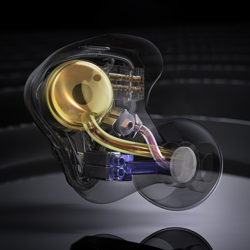 Para garantizar que el transductor dinámico funcionara bien con los transductores de armadura equilibrada, el equipo de desarrollo tomó prestadas ideas de diseño de IEM híbridos de gama alta como el FH9 y el FH7. Dos transductores BA personalizados se encargan de las frecuencias medias y altas. Estos dos transductores BA se diseñaron especialmente junto con el transductor dinámico para tener un pico de resonancia a 2,8 kHz, que también resulta ser una frecuencia de resonancia formada por la forma del oído humano. El resultado no sólo es una transición suave entre el transductor dinámico y el de armadura equilibrada, sino que también garantiza que la transición entre los distintos transductores también se adapte bien a la forma del oído humano, lo que da como resultado un escenario sonoro más natural y, en general, un sonido más suave.
