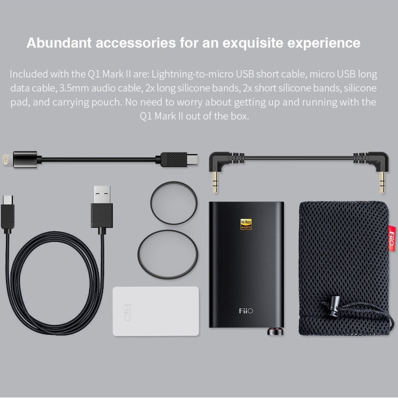 Incluidos con el FiiO Q1 II vienen un cable de Lightning a micro USB, un cable micro USB para conectar al ordenador, un cable de audio de 3.5mm, 4 bandas de silicona para adaptarlo a otros dispositivos, una banda antideslizante de goma y una funda de transporte
