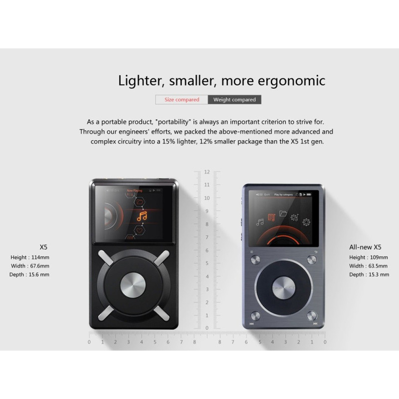 Como producto portable, su capacidad para ser llevado contigo siempre es un criterio importante a tener en cuenta. Gracias a los esfuerzos de los ingenieros de FiiO, se ha conseguido redistribuir de forma mejorada la estructura del X5 con una circuitería más compleja para reducir en un 15% el peso del reproductor y en un 12% su tamaño.