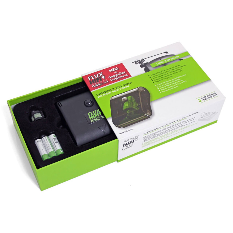El FLUX-Turbo 2.0 convence por sus numerosas ventajas e inaugura una nueva era en el cuidado de los vinilos. El sistema limpia tus tesoros y aumenta así la vida del disco y de la aguja. Al mismo tiempo, la calidad del sonido aumenta, por lo que experimentará un placer auditivo completamente nuevo. Es fácil de usar y se puede utilizar en su tocadiscos.