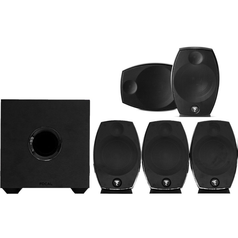 Conjunto Cine en Casa formado por 5 altavoces Focal SIB EVO y 1 subwoofer CUB EVO de 200 Watios digitales. Se incluyen dos soportes de pared